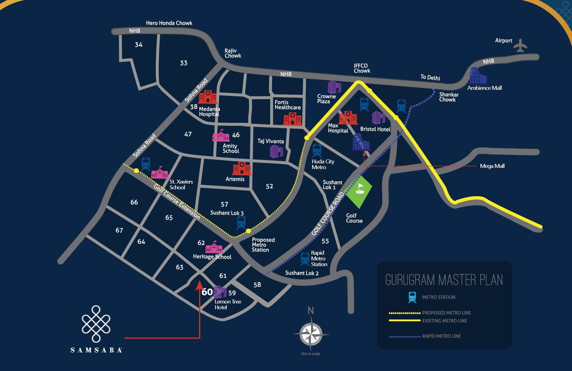 These Breath-Taking Luxurious Villas Are Amidst Refreshing Amidst Nature. The Greenery, The Water Bodies, The Recreational Facilities And The Amenities Will Provide You The Most Desired Luxurious Lifestyle. Not Only That Samsara Provides You Customized Home Interiors And Based On That You Can Choose Two Levels Of Luxury- Samsara Grandeur And Samsara Elegance. Now You Can Choose Your Villa As Per Your Taste And Elegance. Samsara is located at one of the most prestigious areas in Gurgaon, the Golf Course Extension Road.