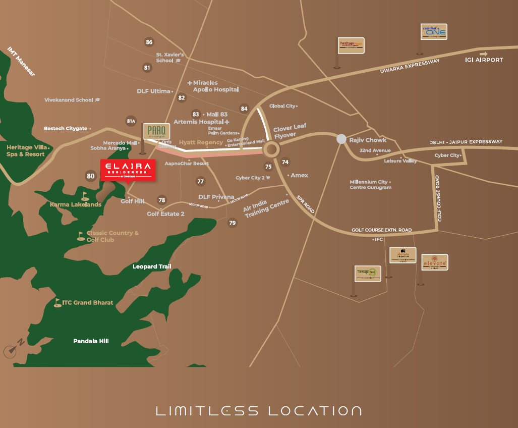- Conscient Elaira Residences is located in Sector 80, Gurgaon, with easy access to the Dwarka Expressway and National Highway.