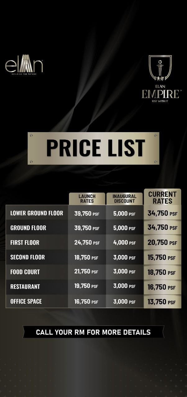 Elan Empire: This project is the finishing touch on the Group’s commercial expeditions in Gurgaon. Located on prime real estate in Sector 66 of Gurgaon, the shopping complex has four levels. You will find retail shops, Supermarkets, clinics, restaurants and food courts all under one roof.