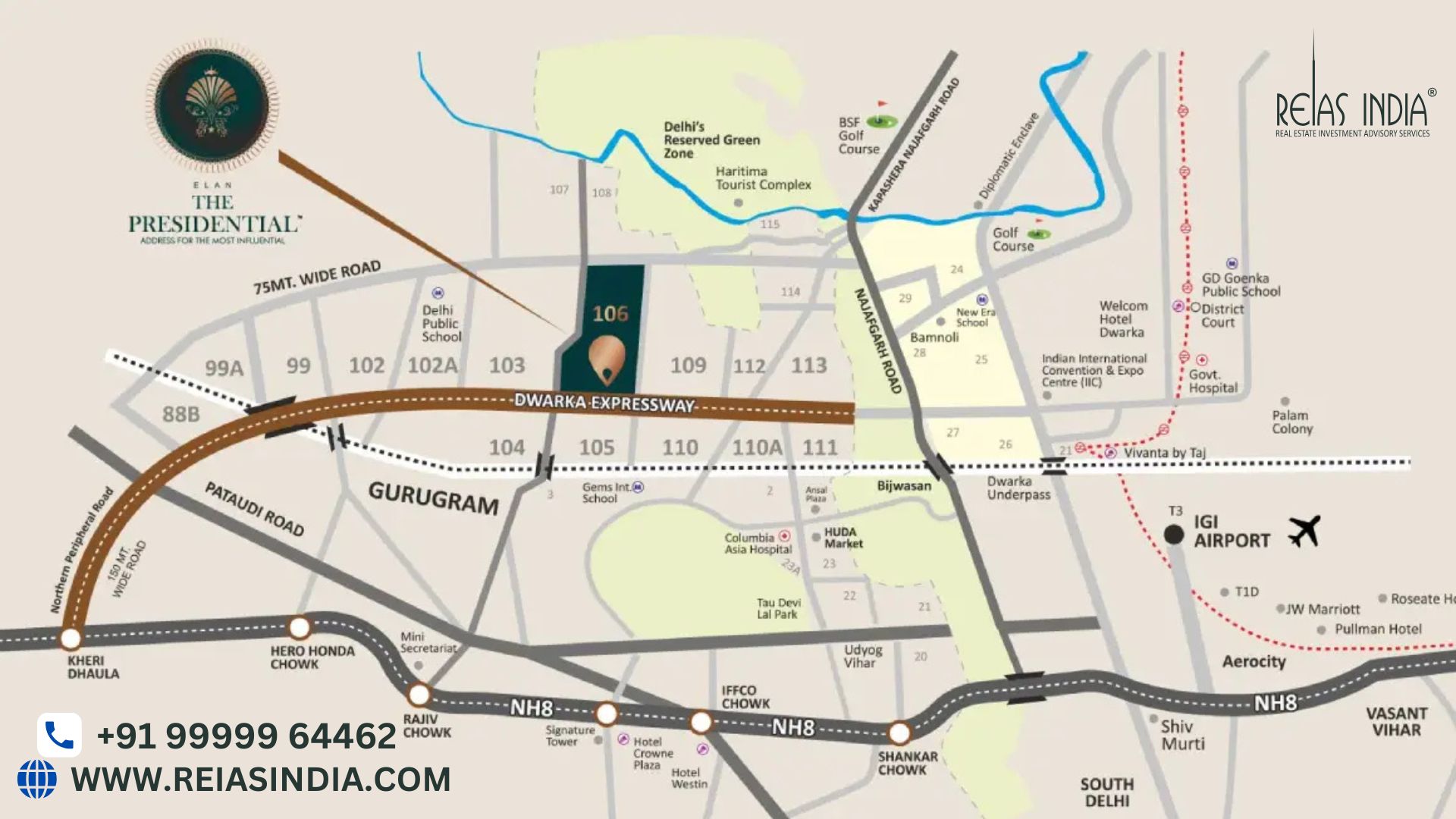 Located in the heart of Sector 106, Gurgaon, Elan The Emperor offers exceptional connectivity to key areas of both Gurgaon and Delhi. Residents enjoy easy access to the Dwarka Expressway, providing seamless travel to Indira Gandhi International Airport, Dwarka, and various districts in Delhi.