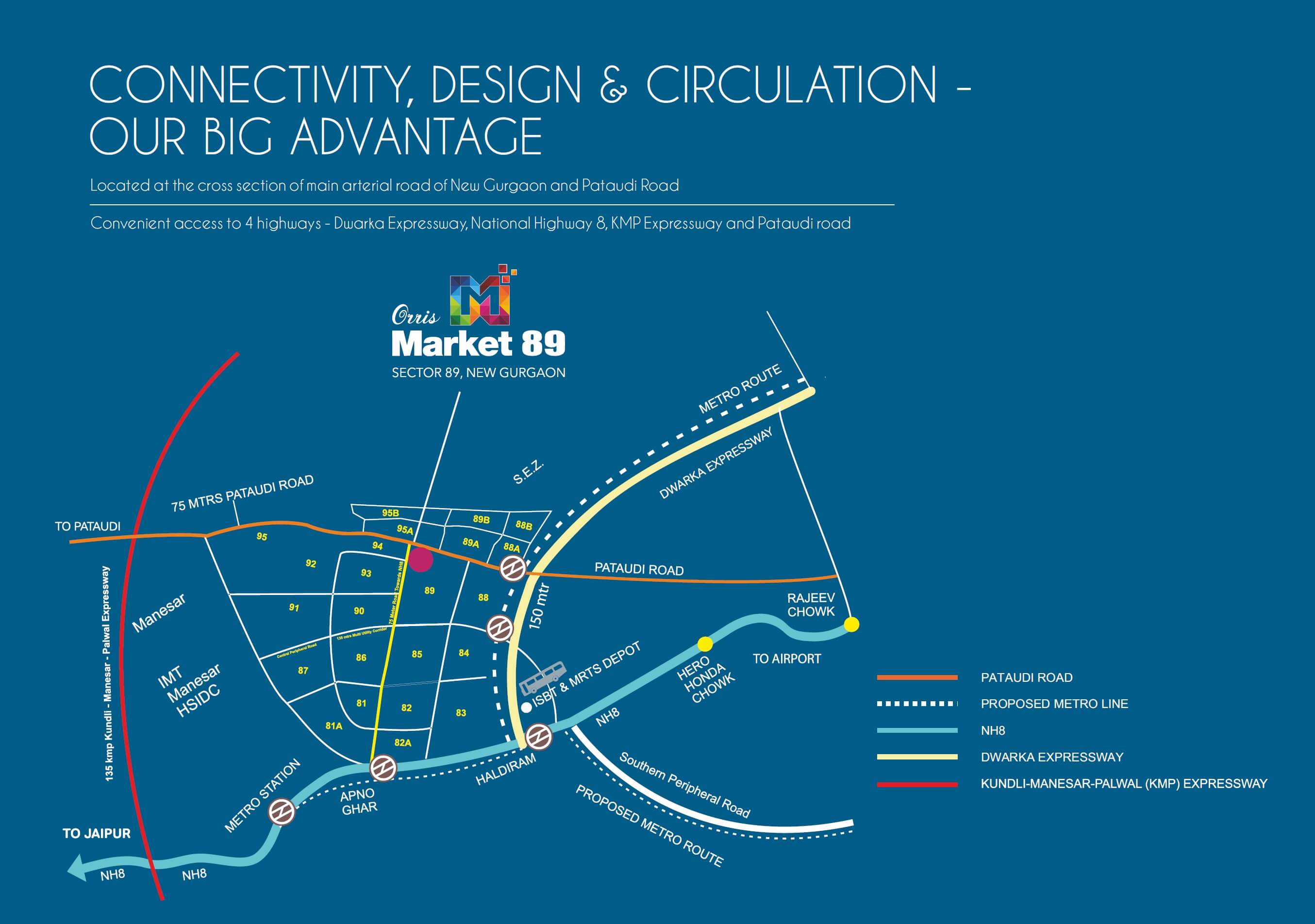 The meticulously planned development is located in sector 89 of Gurugram on the cross-junction area connected through Dwarka Expressway, Pataudi Road, and Internal sector road to make it happening and bustling.The world-class destination is going to be the social zone for the new generation of the new Gurugram. It will together bring the experience of new-age hospitality to feel the power of non-conventional renewable. Enjoy shopping, food, entertainment, and global living in international, eco-friendly designed boutique residences with Orris Market City 89. The location is designed to set a new definition for the concept of a luxury lifestyle when the time comes. The project is spread over an area of 2500 acres of land surrounded by nearby residential developments and townships.