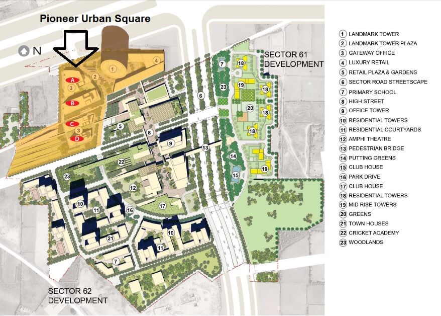 Pioneer Urban Square Gurgaon, offers 450,000 square feet of flexible office space spread across four towers. Its futuristic design made on international specifications uplifts it to global standards. The motto of Urban Square Gurgaon is maximum utilization of space and energy through its innovative architectural design and sustainability options. The primary advantage of this property lies in its centralized location and high visibility factor. It is located on the 90-meter-wide Golf Course Extension road, a mere 25 minutes drive from IGI airport and on the metro corridor