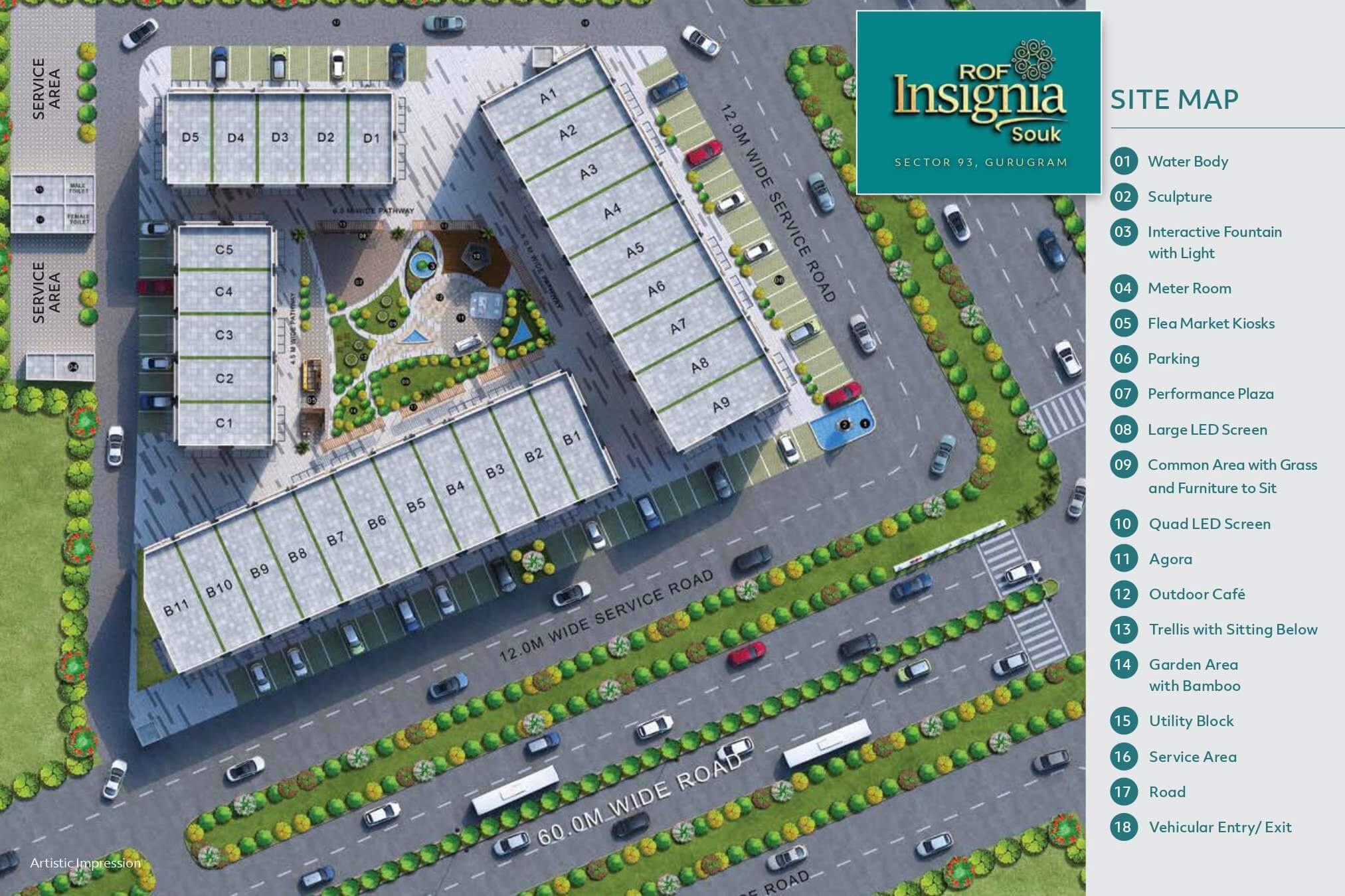 ROF Insignia Souk is one such unique retail concept which boasts of opportunities at every corner with 30 premium plots that are 2 sided open with sizes ranging from 75 metres to 125 metres.ROF Insignia Souk offers you to customize your world your own way as each plot is accessible from both sides and has the option to develop five levels - Ground + 4, and basement to create your own identity. Truly your own personal Insignia!
